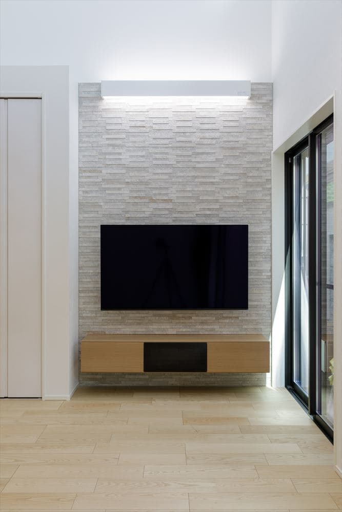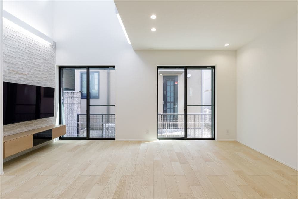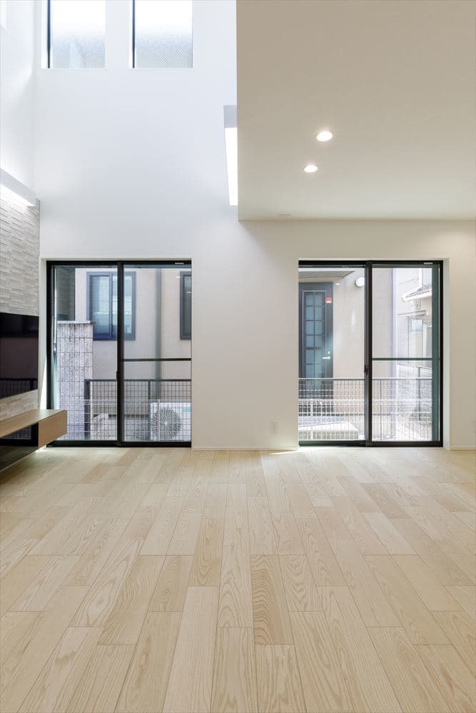 間口が狭く奥行が長い敷地ですが、SE構法の特徴を生かして明るく開放的な空間を実現しています。リビングの吹き抜けからは光が差し込んできて、隣地が迫っていても家のを明るくしてくれます。