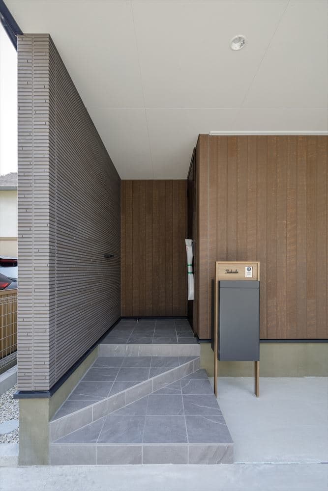 正面の外観は、窓がなく、シンプルでスクエアなデザインのフォルムが特徴です。