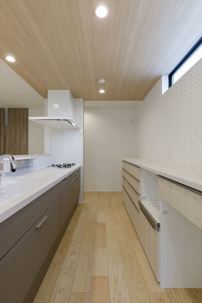 対面キッチンはオープンな配置で、キッチン天井のみ木目のデザインにして、変化のある空間となっています。