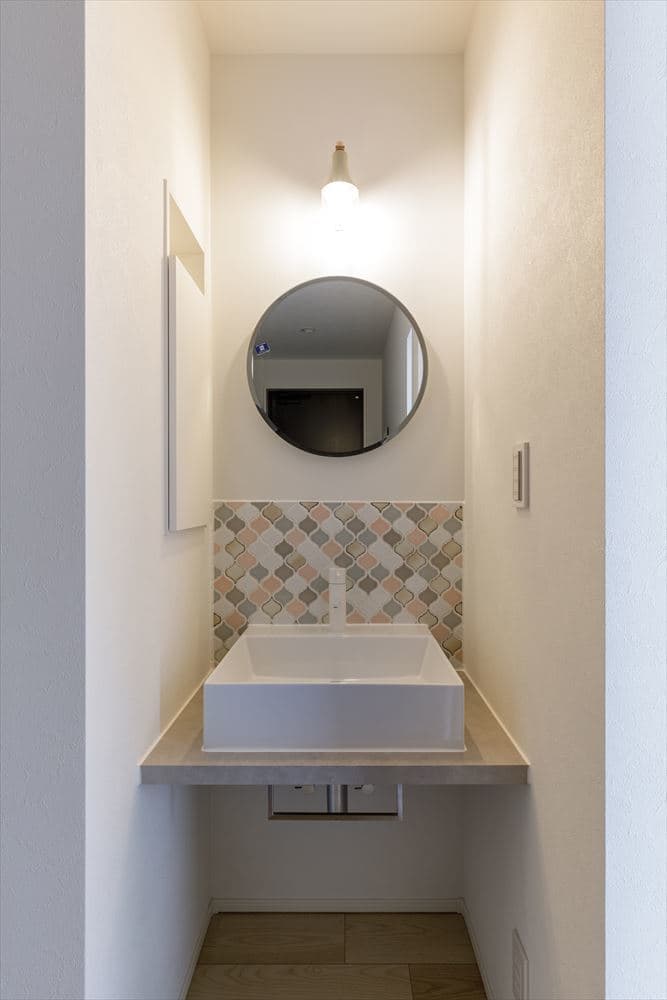 お客様のこだわりの玄関の洗面台も、丸い鏡とタイル張りに造作のデザインでおしゃれなスペースとなりました。