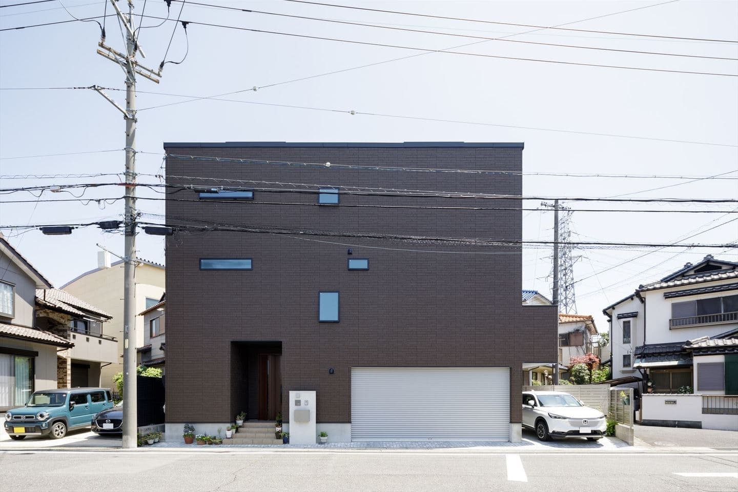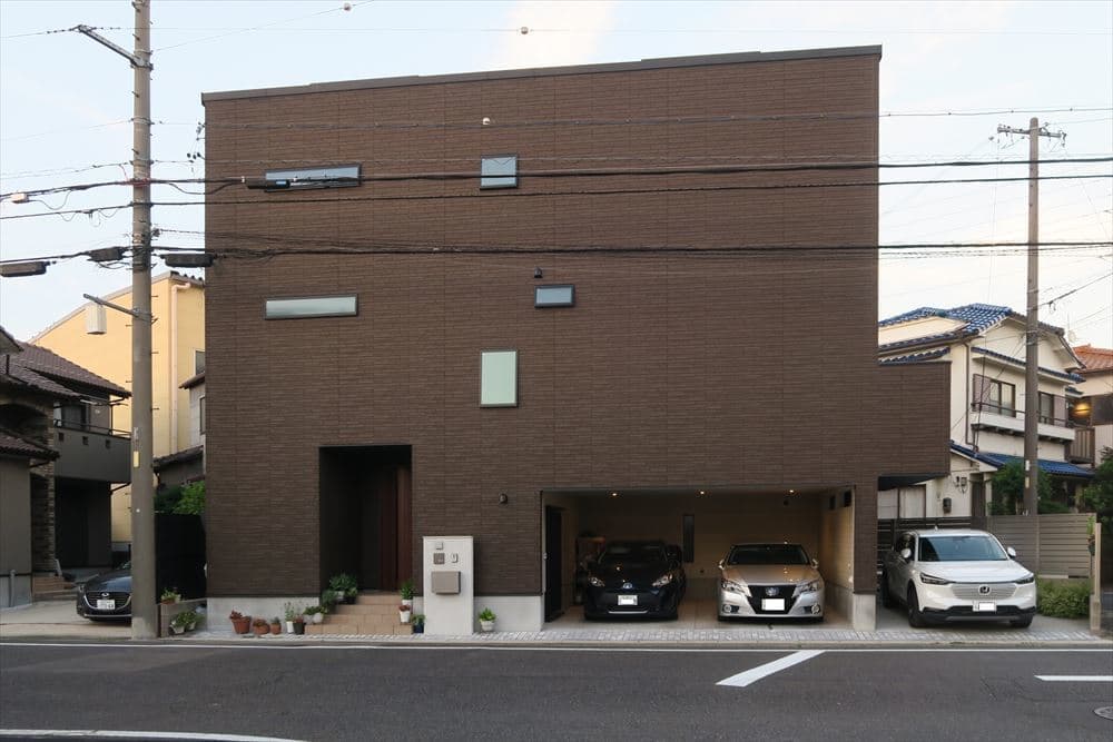 2台分の車を家の中に駐車できるビルトインガレージを設けた「ガレージハウス」です。ガレージの間口は5.46m、奥行5.56mと、在来木造では不可能な空間です。