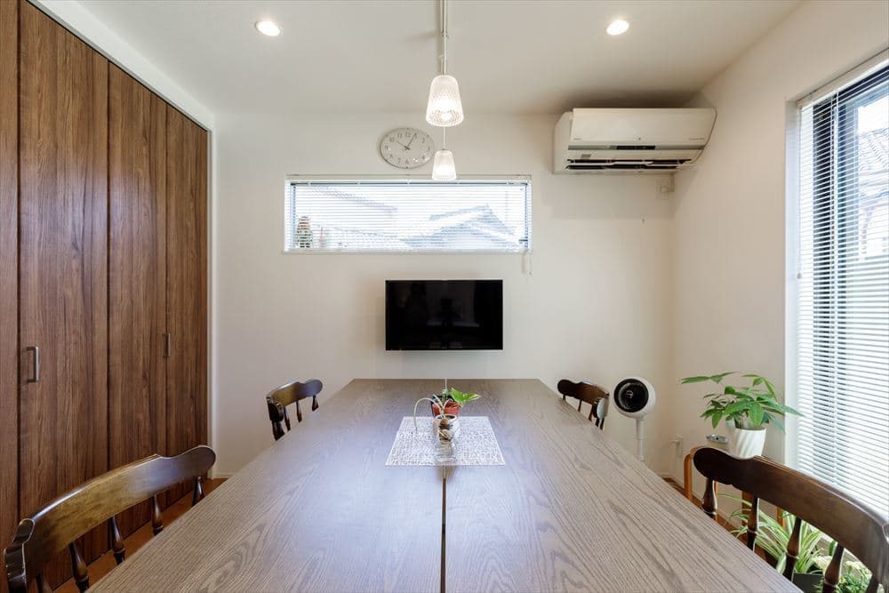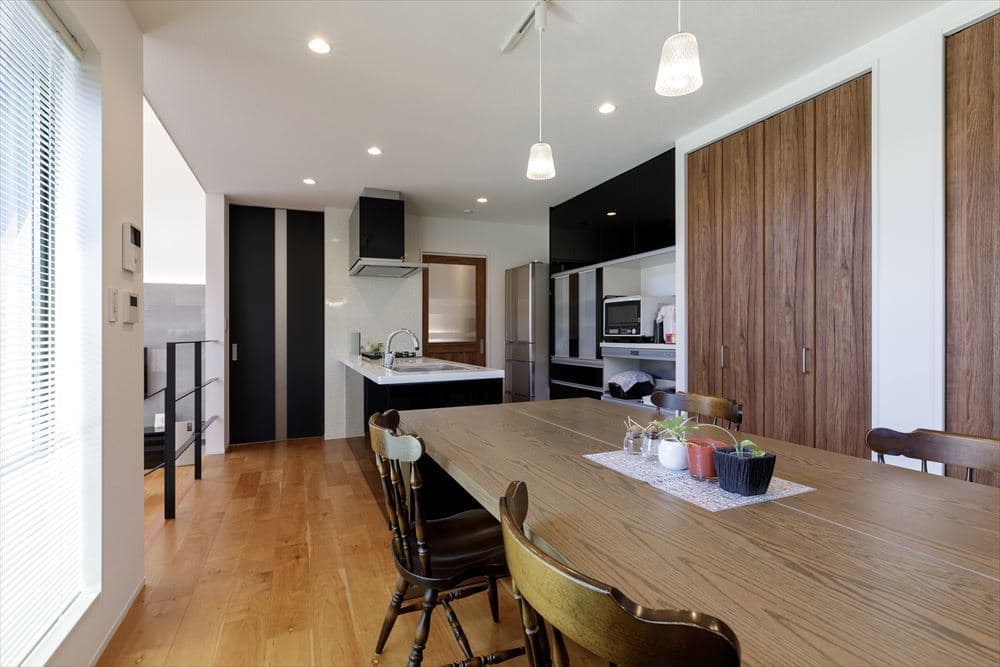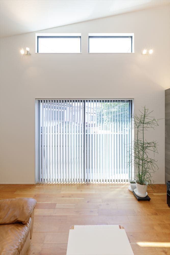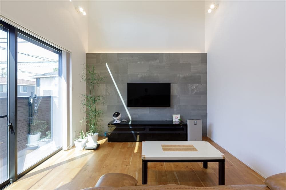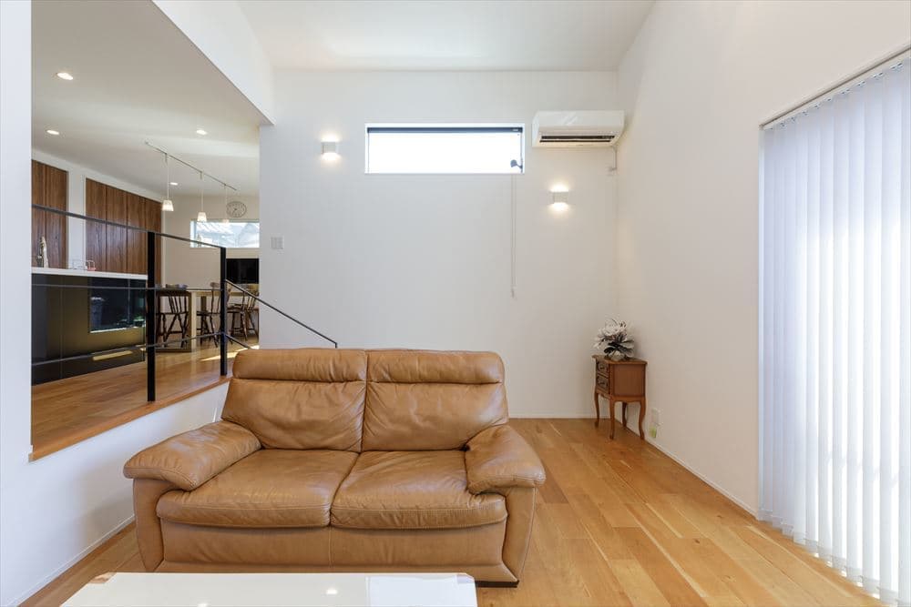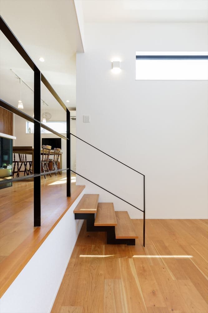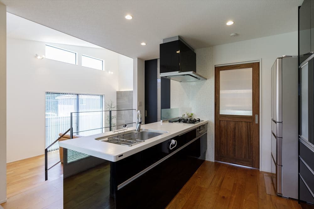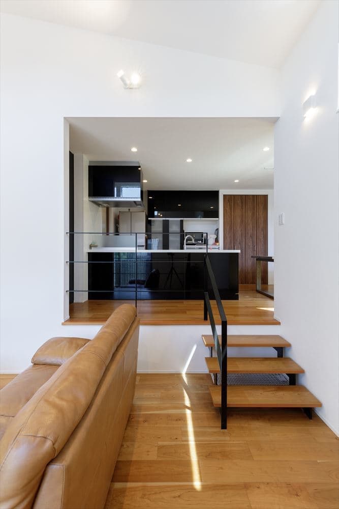 2階にあるLDKは24帖と大空間となっていて、リビングは高さ5.6mの吹き抜けのある開放的な空間です。また、リビングは1Fのガレージの天井高を活かして階段4段分下がり、スキップフロアで段差をつけて変化のある空間となっています。