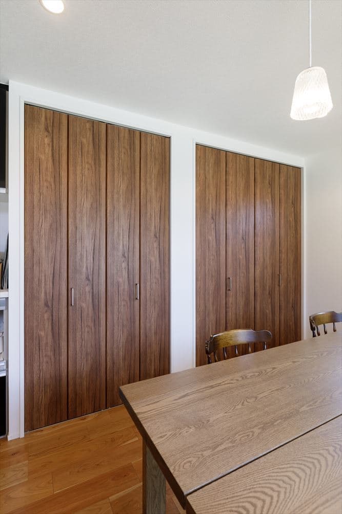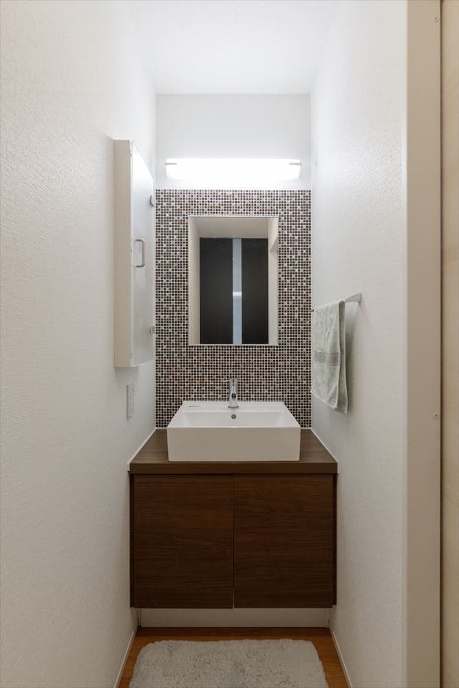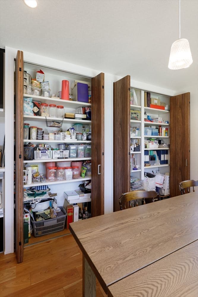 洗面台もオーダーメイドの造作で仕上げ、収納も玄関ウォークインクロークや寝室や洋室のウォークインクローゼット、そして小屋裏収納やパントリーなど、全体的に収納力がとても高いお家となっています。